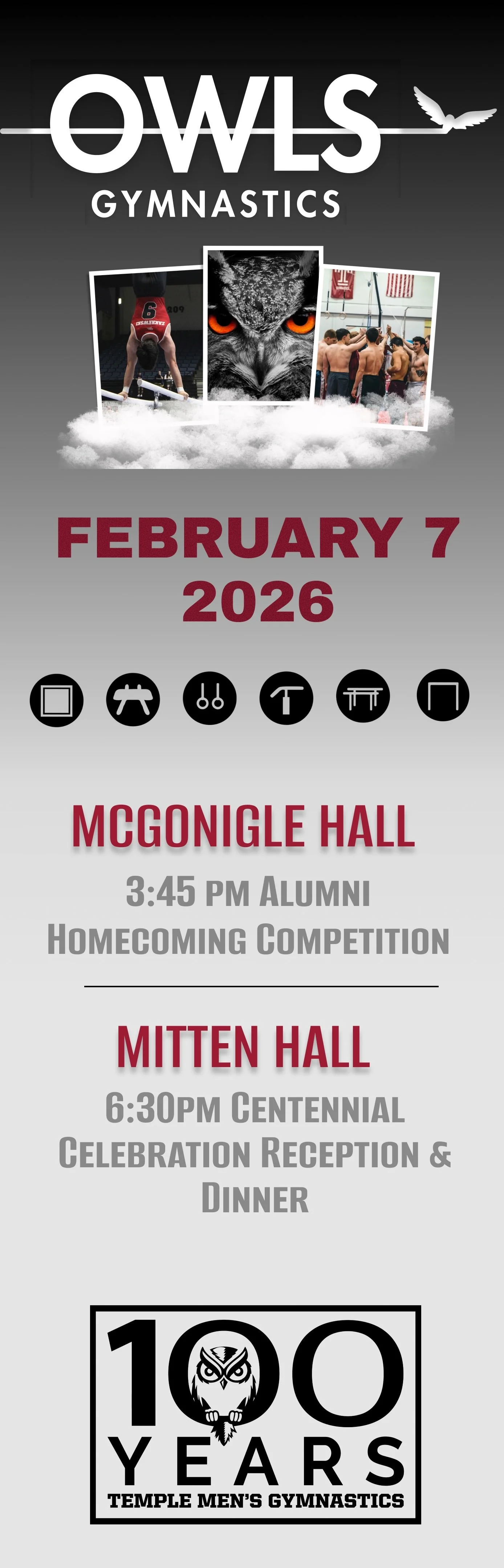 In conjunction with the 7th Annual Fred Turoff Invitational, which will feature 500 young gymnastics; Owls Gymnastics, TUMG and PBG will be hosting the our Temple 100 Alumni Homecoming in McGonigle Hall for a 6-team high-energy action-packed and high level GymAct Collegiate Competition and we are pulling out all the stops! Also we are bring the ECAC/EIGL Cup HOME and will be with us throughout the weekend and on display for all to see as huge part of our legacy.
